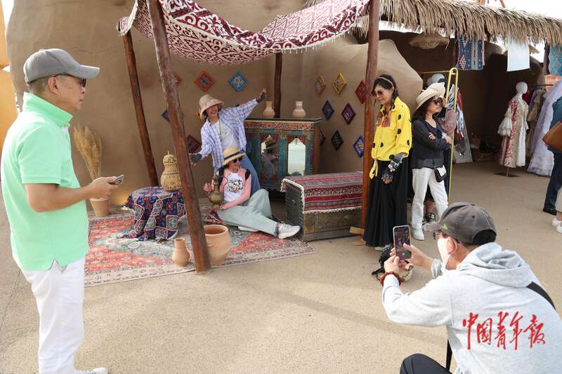 9月9日,新疆巴州尉犁縣羅布人村寨景區(qū),來自上海的游客在合影留念。2025年1月至8月,尉犁縣累計(jì)接待國內(nèi)游客313.6萬人次,同比增長23.55%,實(shí)現(xiàn)游客總花費(fèi)20.98億元,同比增長27.38%。中青報(bào)·中青網(wǎng)記者 王鑫昕/攝