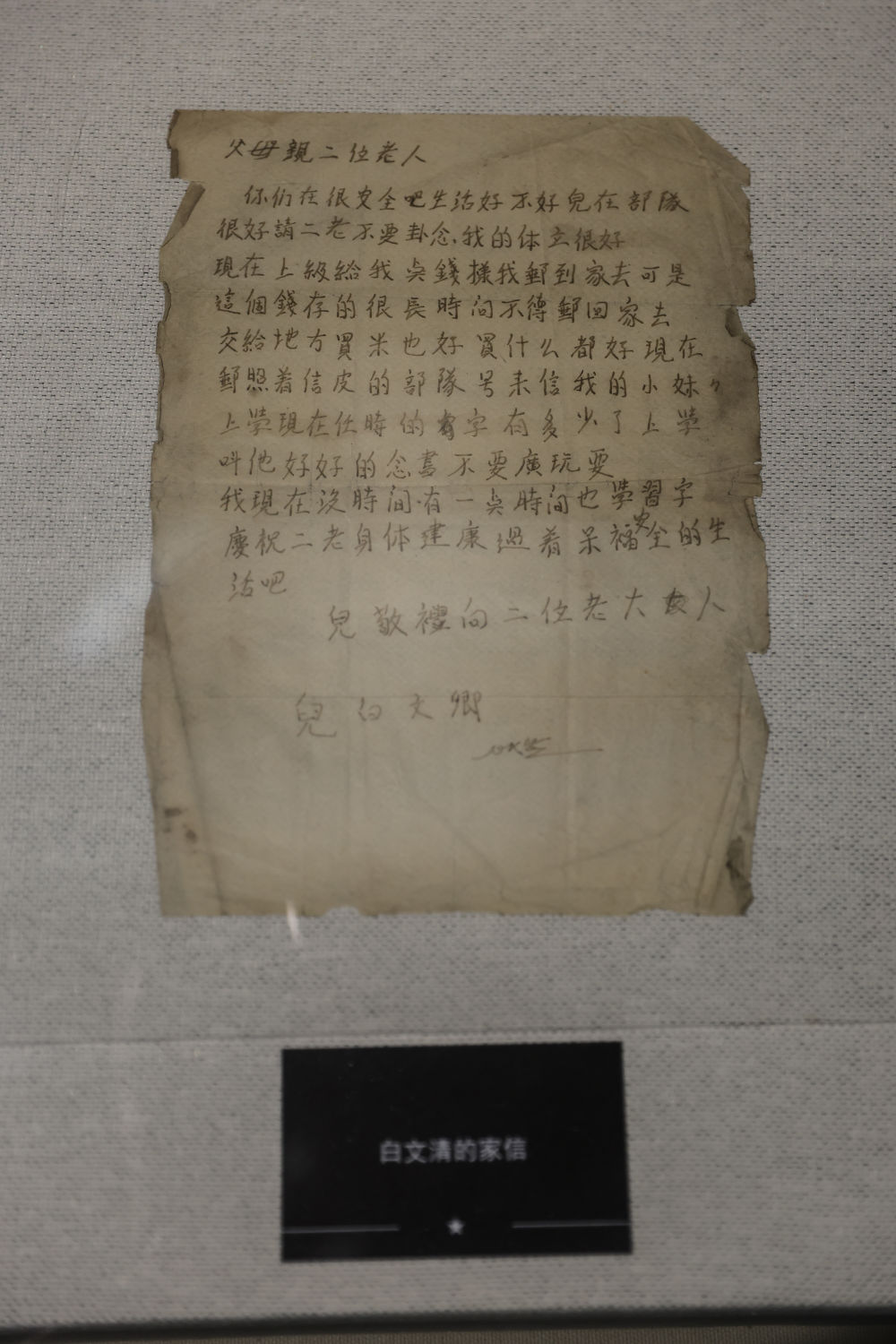 這是沈陽抗美援朝烈士陵園紀(jì)念館內(nèi)展出的志愿軍戰(zhàn)士白文清的家書(2025年9月10日攝)。 新華社記者 潘昱龍 攝