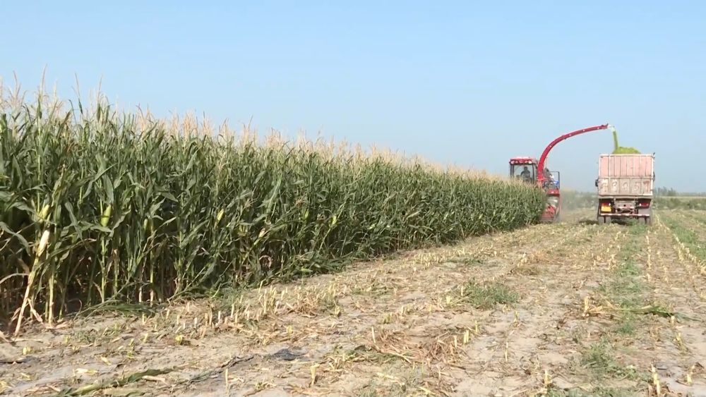 新疆巴音郭楞蒙古自治州焉耆縣的1.5萬畝青貯玉米迎來豐收。在永寧鎮(zhèn)九號(hào)渠村,大型青貯收割加工機(jī)將一株株玉米從根部割斷,粉碎后拋入集草車。