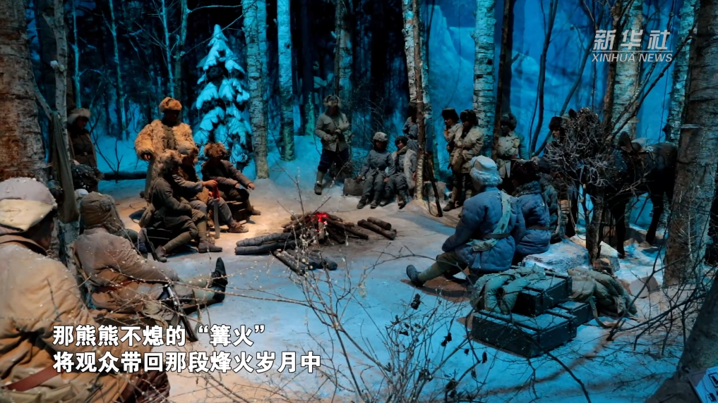 “九·一八”歷史博物館內(nèi),抗聯(lián)戰(zhàn)士密林宿營地的模擬場景吸引觀眾駐足,那熊熊不熄的“篝火”,將觀眾帶回那段烽火歲月中。