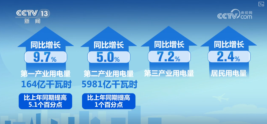 數據顯示,第一產業(yè)和第二產業(yè)用電量保持較快增長,第三產業(yè)和居民用電量有所回落。具體看,第一產業(yè)用電量164億千瓦時,同比增長9.7%,比上年同期提高5.1個百分點;第二產業(yè)用電量5981億千瓦時,同比增長5.0%,比上年同期提高1個百分點;第三產業(yè)和居民用電量分別同比增長7.2%和2.4%。