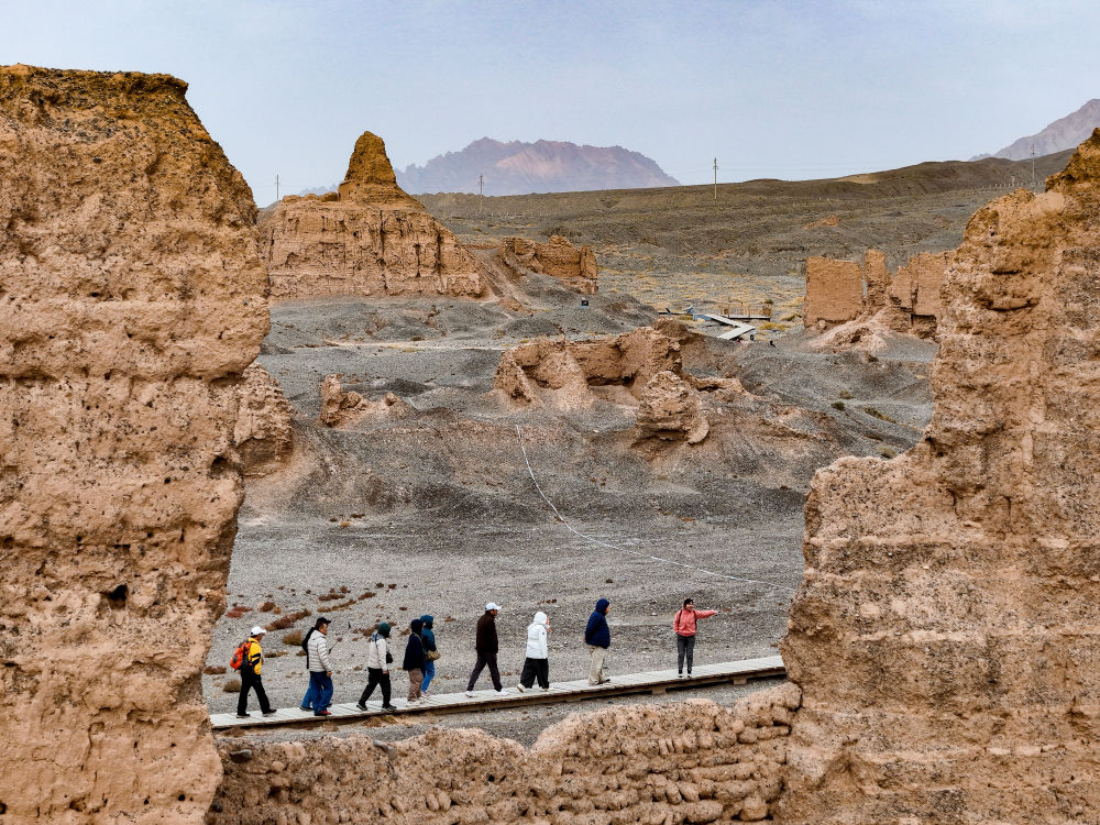 游客在克孜爾尕哈烽燧參觀。新華社記者 胡虎虎 攝