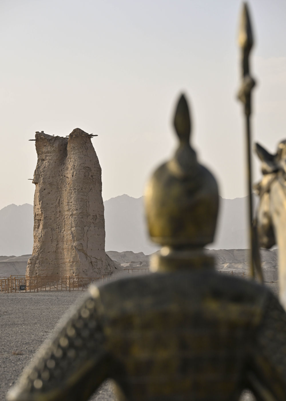 克孜爾尕哈烽燧與兵士塑像相映成趣。新華社記者 胡虎虎 攝
