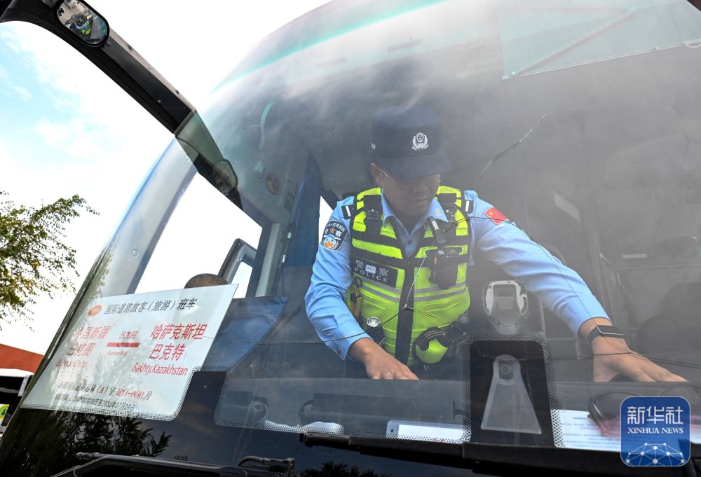 ↑9月17日,巴克圖出入境邊防檢查站的移民管理警察在巴克圖口岸查驗經由該口岸出境前往哈薩克斯坦的客車。