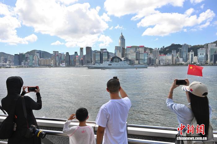 10月3日,海軍戚繼光艦、沂蒙山艦編隊(duì)完成出航前的各項(xiàng)準(zhǔn)備工作,駛離香港海域,前往柬埔寨、泰國(guó)、新加坡三國(guó)。尖沙咀碼頭有民眾送別海軍戚繼光艦、沂蒙山艦編隊(duì)。圖為民眾在尖沙咀碼頭拍攝海軍沂蒙山艦。 中新社記者 李志華 攝