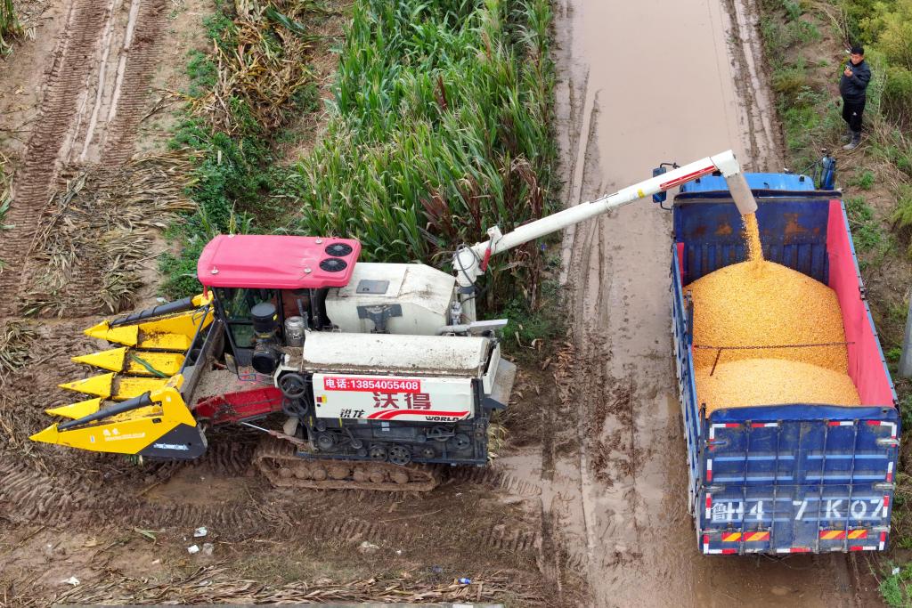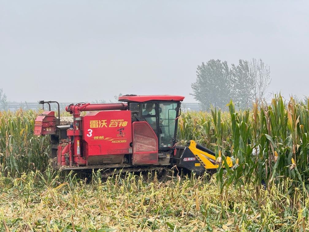 2025年10月11日,在安徽省淮北市濉溪縣百善鎮(zhèn)張莊村,從河南駐馬店調(diào)運(yùn)過(guò)來(lái)的履帶式收割機(jī)在收割玉米。新華社發(fā)(徐弘揚(yáng) 攝)