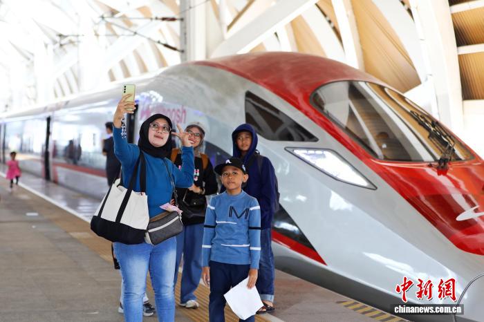 當(dāng)?shù)貢r間6月26日,旅客在印尼雅加達哈利姆高鐵站與列車合影。雅萬高鐵由中印尼兩國合作建設(shè),最高運營時速350公里?!≈行律缬浾?李志全 攝