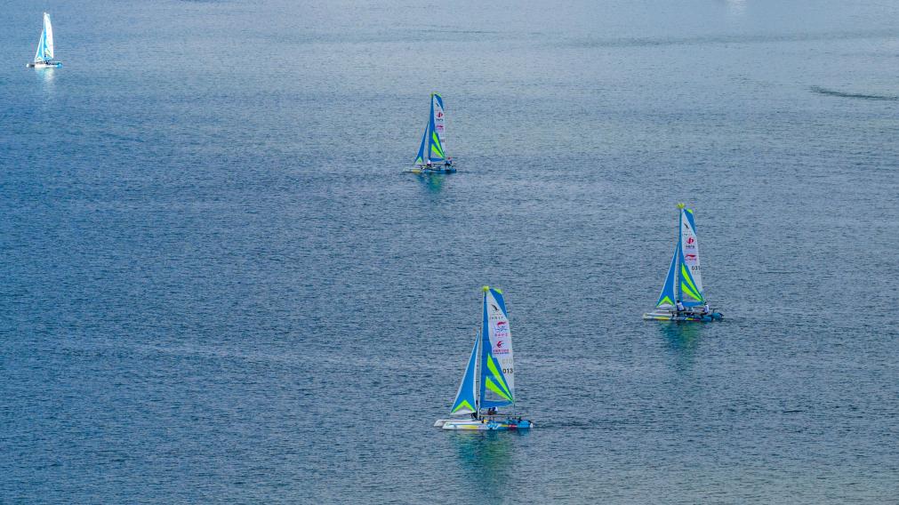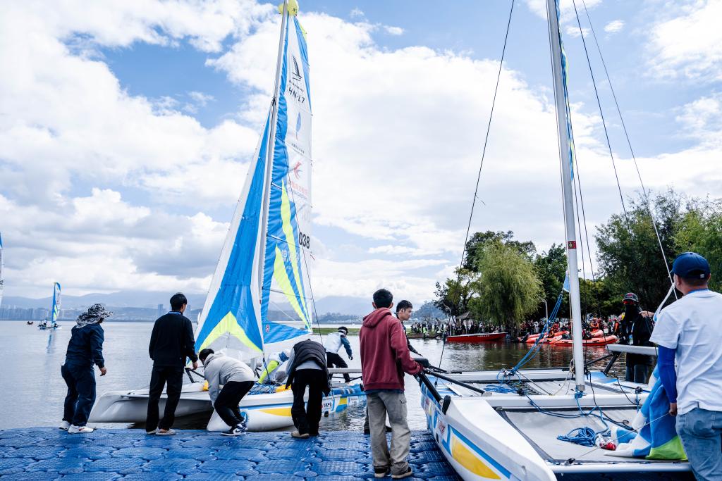 10月25日,中國(guó)萬水千帆賽大理站在云南省大理白族自治州開賽,圖為參賽船只從出發(fā)點(diǎn)下水。新華社記者 胡超 攝