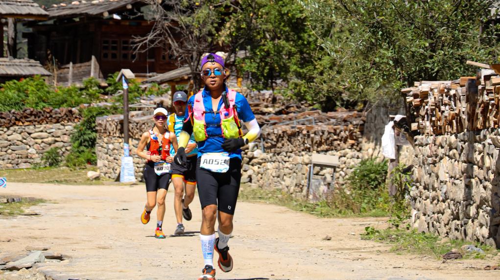 9月27日,首屆巴松措山地越野跑在西藏林芝市工布江達(dá)縣巴松措風(fēng)景區(qū)舉行,圖為參賽選手穿過古村落錯(cuò)高村。新華社記者 格桑朗杰 攝