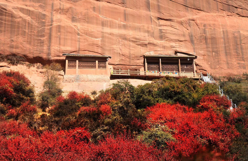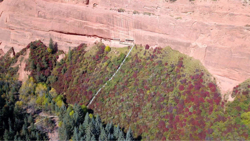 開鑿于紅砂崖壁上的金塔寺石窟,要上去得爬240級(jí)臺(tái)階