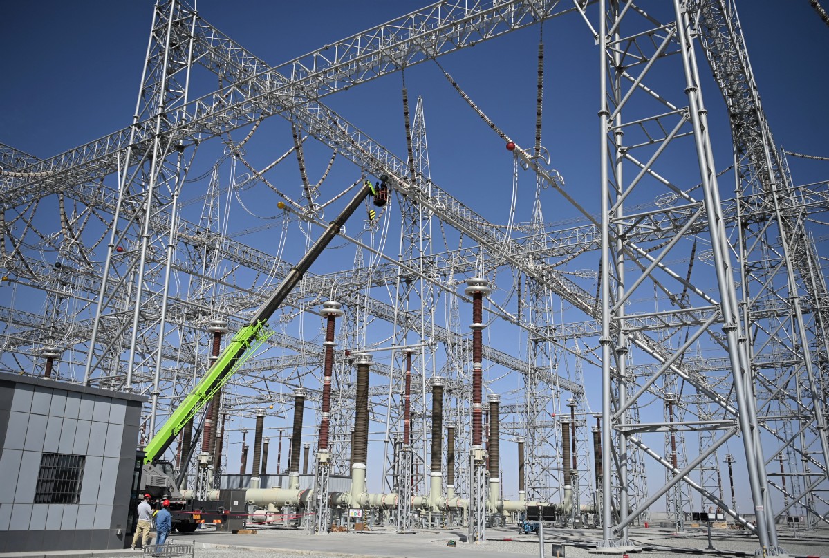 2025年9月28日,且末750千伏變電站新建工程建設(shè)現(xiàn)場,作業(yè)人員對管母金具進行檢查復(fù)驗。(馬元 攝)