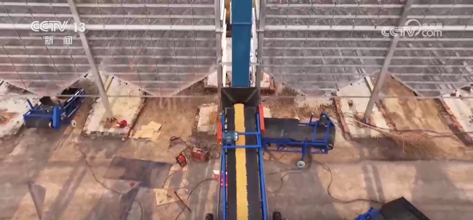 烘干后的玉米去哪里了?大家抬頭看,答案在樓頂上這些高速傳送帶,玉米通過傳送帶進(jìn)入下一個(gè)加工區(qū)。