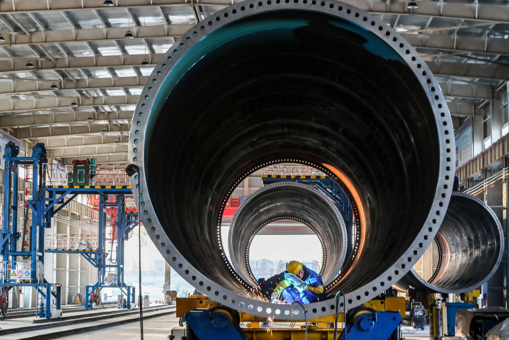 11月20日,在甘肅省酒泉經(jīng)濟技術開發(fā)區(qū)的中國水電四局(酒泉)新能源裝備有限公司塔筒制造車間,工作人員進行風機塔筒焊接作業(yè)。新華社記者 郎兵兵 攝