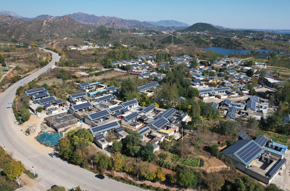 11月2日拍攝的河北省平山縣西柏坡鎮(zhèn)北莊村兆瓦級“光儲”智能微電網(wǎng)示范工程項目中的屋頂光伏發(fā)電板(無人機照片)。新華社記者 楊世堯 攝