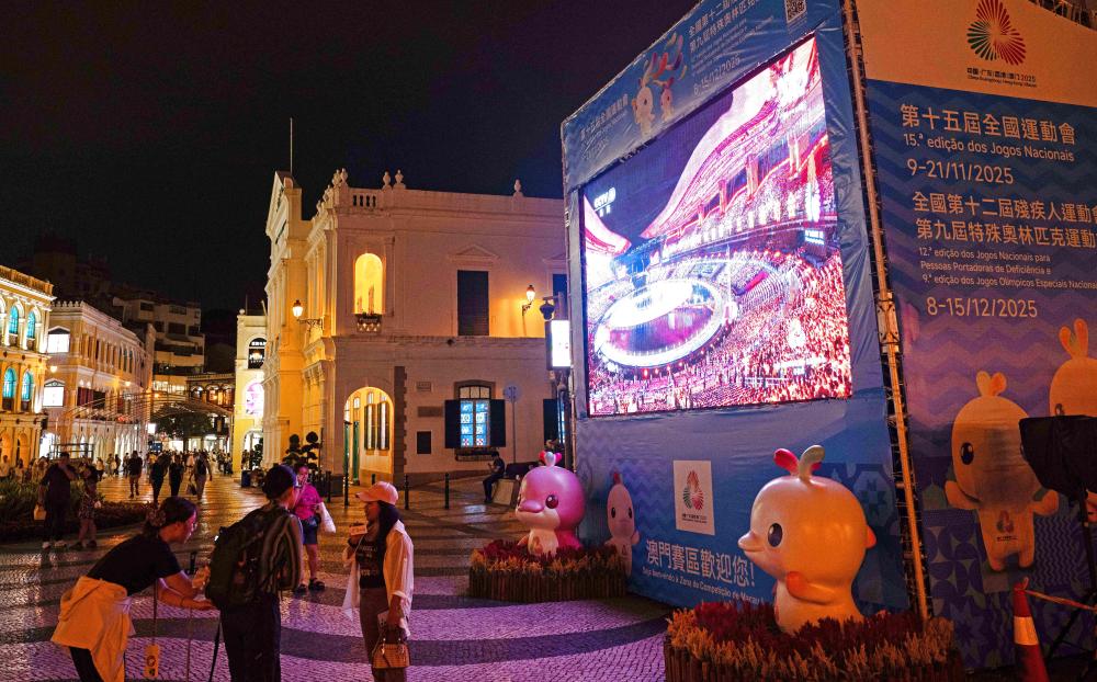 11月9日,群眾在澳門議事亭前地觀看第十五屆全國運動會開幕式直播。