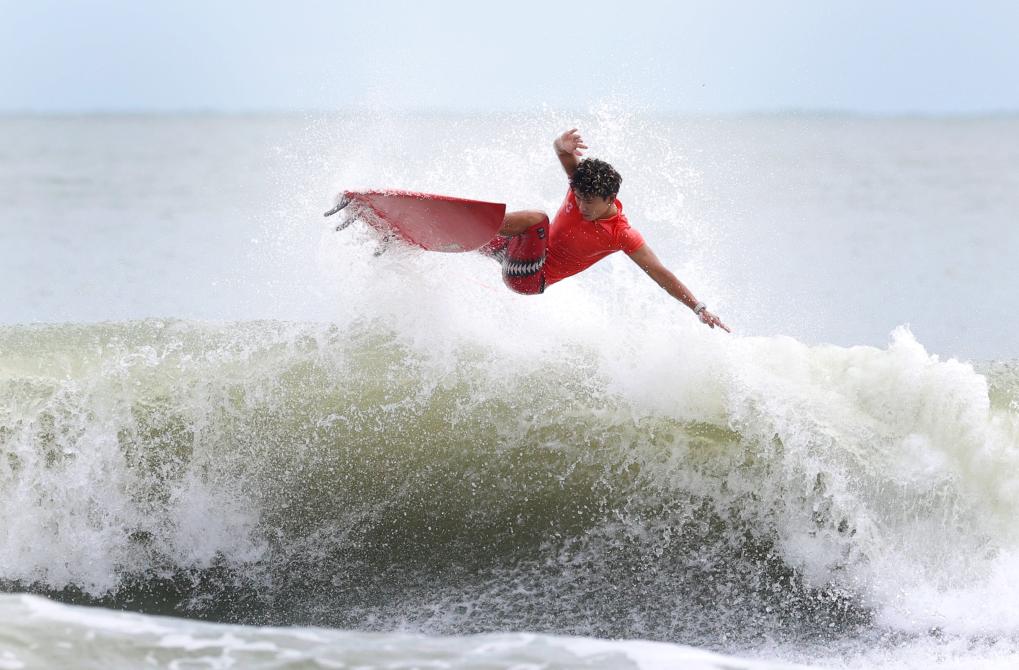 11月13日,河南隊選手張家昊在沖浪男子短板第一輪比賽中。