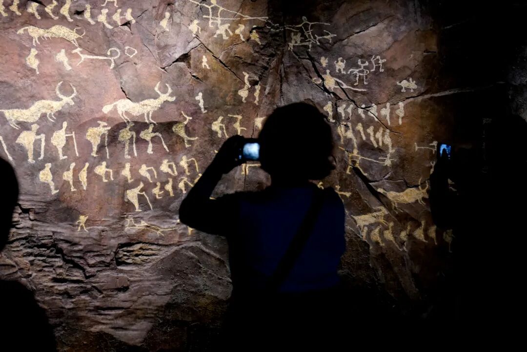 2024年10月19日,西藏拉薩,參觀者在西藏博物館內拍攝巖畫。 中新社記者 李林 攝