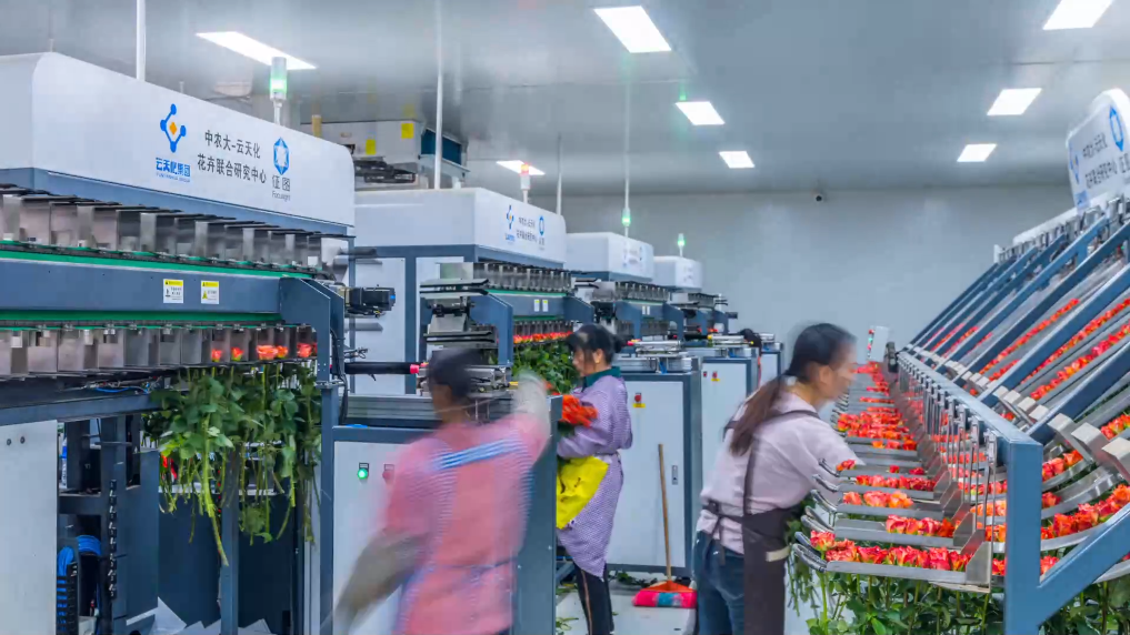 花卉大棚“智慧大腦”中央控制系統(tǒng)實(shí)時(shí)監(jiān)測與調(diào)控各類環(huán)境指標(biāo);智慧檢測控制水肥一體化循環(huán)系統(tǒng)確保植株健康生長;采后處理中心紅外成像識別系統(tǒng)實(shí)現(xiàn)自動分級分類,自動捆扎與包裝。