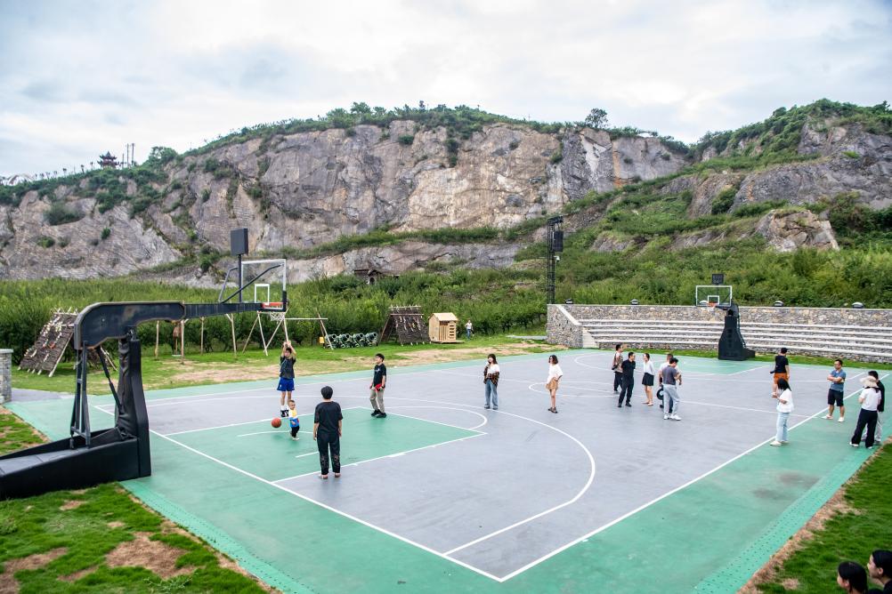 2025年8月16日,在重慶市北碚區(qū)靜觀鎮(zhèn)中華村,游客在礦坑修復(fù)改造的運(yùn)動(dòng)場(chǎng)內(nèi)打球。新華社記者 唐奕 攝