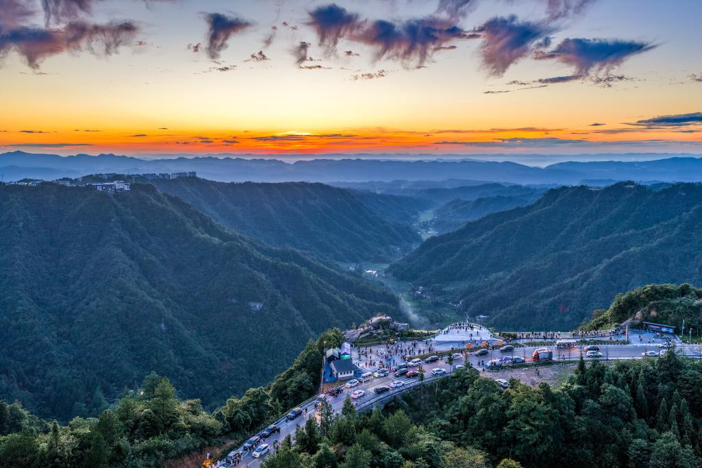 2025年8月20日,游客在重慶市石柱縣黃水鎮(zhèn)環(huán)湖路觀景臺(tái)欣賞晚霞景色(無人機(jī)照片)。新華社記者 唐奕 攝