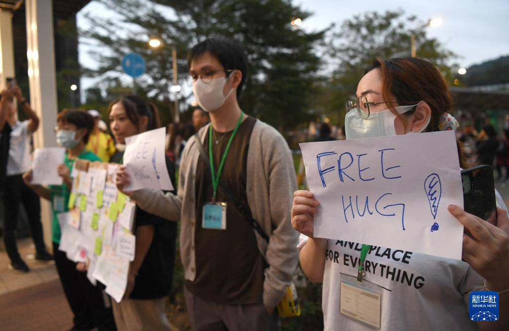 11月30日,義工在香港大埔廣福休憩處舉牌提供免費(fèi)擁抱,提供心理疏導(dǎo)。新華社記者 陳鐸 攝