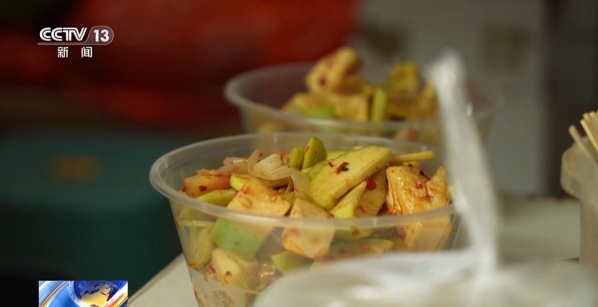 總臺記者 楊雪:街頭巷尾,最具廣西特色的還得是酸嘢,而紅糖酸嘢更是將酸、甜、辣、咸完美融合。將新鮮芒果、菠蘿、番石榴等食材切塊,加入紅糖粉和秘制調(diào)料攪拌均勻,再根據(jù)口味加入辣椒粉,紅糖的蜜甜與水果的清甜結合,吃起來別有一番風味。