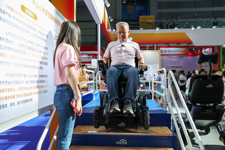 2025年9月12日,在2025深圳國際智慧養(yǎng)老產(chǎn)業(yè)博覽會上,觀眾在展會現(xiàn)場體驗(yàn)一款可以上下樓梯的智能出行機(jī)器人。新華社記者 梁旭 攝