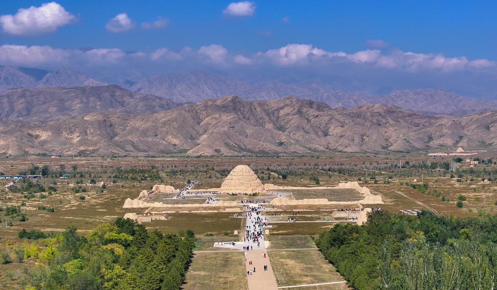 2025年10月2日,游客在西夏陵遺址區(qū)參觀三號陵(無人機照片)。新華社記者 馮開華 攝