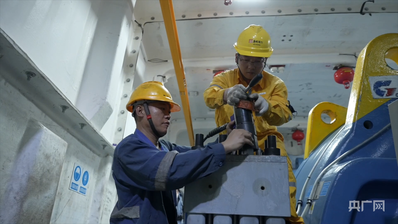 李亞雄與同伴對風(fēng)機(jī)內(nèi)部部件進(jìn)行巡檢維護(hù)(央廣網(wǎng)發(fā) 受訪者供圖)