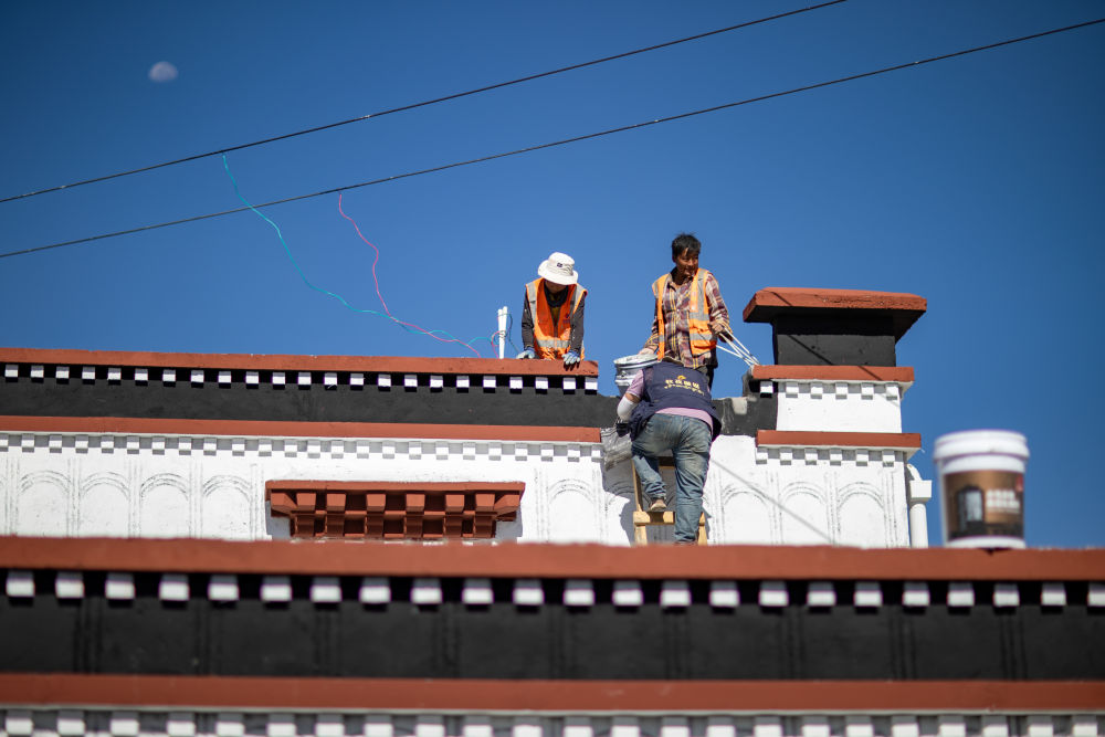 2025年8月11日,定日縣曲洛鄉(xiāng)措昂村彩繪工匠扎西、旦增貢加、拉巴在工作現(xiàn)場(chǎng)。他們都是本村受災(zāi)群眾,通過參與新房建設(shè)獲得勞動(dòng)報(bào)酬。