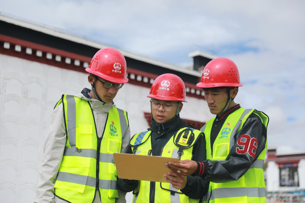2025年8月10日,技術(shù)人員在中國中鐵定日縣曲洛鄉(xiāng)措昂村民房恢復(fù)重建項(xiàng)目施工現(xiàn)場(chǎng)商討方案。