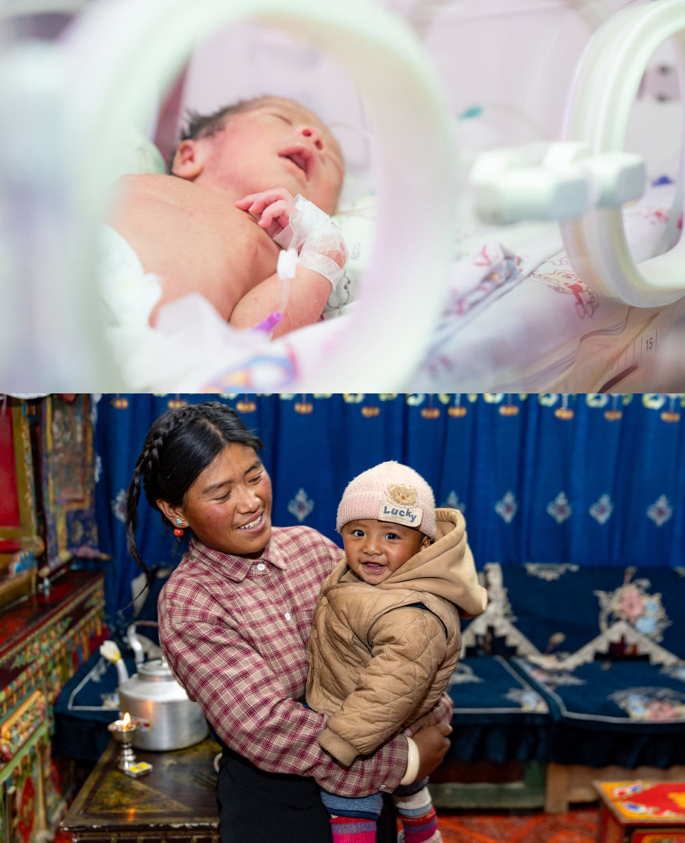 拼版照片:上圖為2025年1月9日,地震中第一個(gè)出生的“地震寶寶”次仁拉巴(1月8日7時(shí)40分左右出生)在日喀則市人民醫(yī)院新生兒科病房睡覺。下圖為2025年11月11日,次仁拉巴和媽媽強(qiáng)瓊在新房里。
