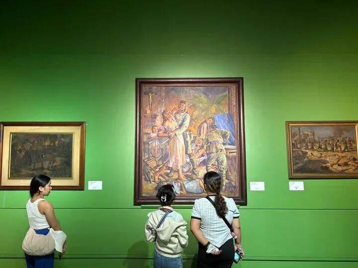 參觀者在菲律賓國(guó)家美術(shù)館二戰(zhàn)主題展廳參觀,該展廳陳列著二十余幅描繪日軍暴行的畫作。(新華社記者 張怡晟 攝)