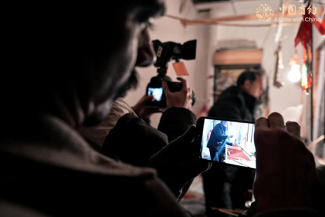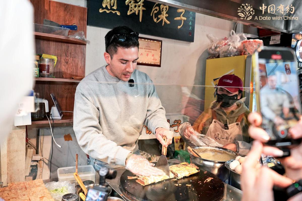 在古文化街,國(guó)際采訪(fǎng)團(tuán)的外國(guó)朋友們學(xué)習(xí)了捏泥人,體驗(yàn)了皮影戲表演,還親手制作并品嘗了正宗的天津煎餅,沉浸式感受了一把好吃又好玩的天津范兒。