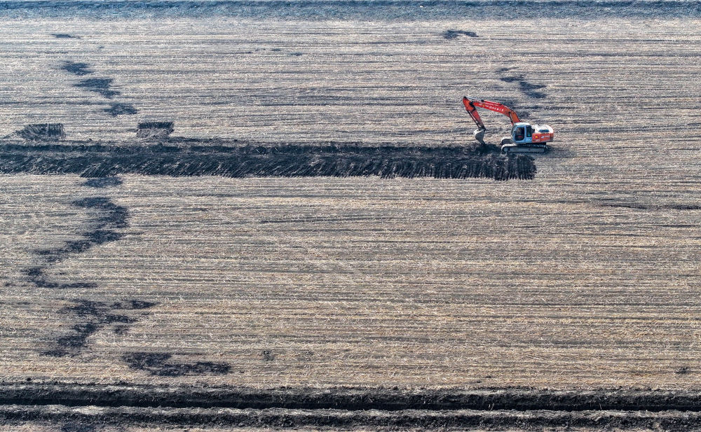 2025年3月11日,在天津市津南區(qū)八里臺(tái)鎮(zhèn)大韓莊村,工人駕駛挖掘機(jī)進(jìn)行高標(biāo)準(zhǔn)農(nóng)田施工作業(yè)(無人機(jī)照片)。新華社記者趙子碩 攝