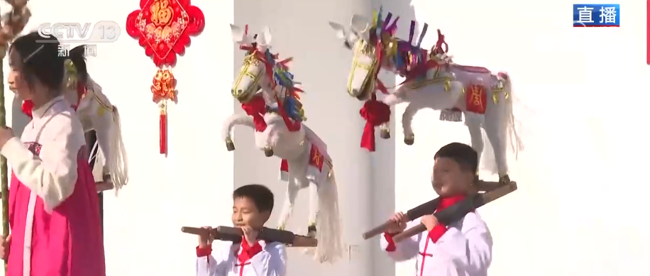 逛得盡興,更有好戲看!市集舞臺區(qū)的非遺民俗表演,表演者都是小朋友。首先登場的是背馬表演,它是國家級非遺“河上龍燈勝會”的重要組成部分。孩子們身上背著裝飾精美的“竹馬”,踏著鼓點(diǎn)昂首前行,它們也是龍燈隊(duì)伍的“開路先鋒”,瞬間把熱鬧氛圍給拉滿。