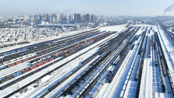 裝滿物資的貨運列車在黑龍江省哈爾濱南站編組站場整裝待發(fā)。“三九”天以來,針對北方降溫降雪天氣,中國鐵路哈爾濱局集團有限公司哈爾濱南站積極開展電煤、生產(chǎn)物資保供專項行動,全力保障民生物資運輸需求(2026年1月15日攝,無人機照片)。新華社發(fā)(原勇 攝)
