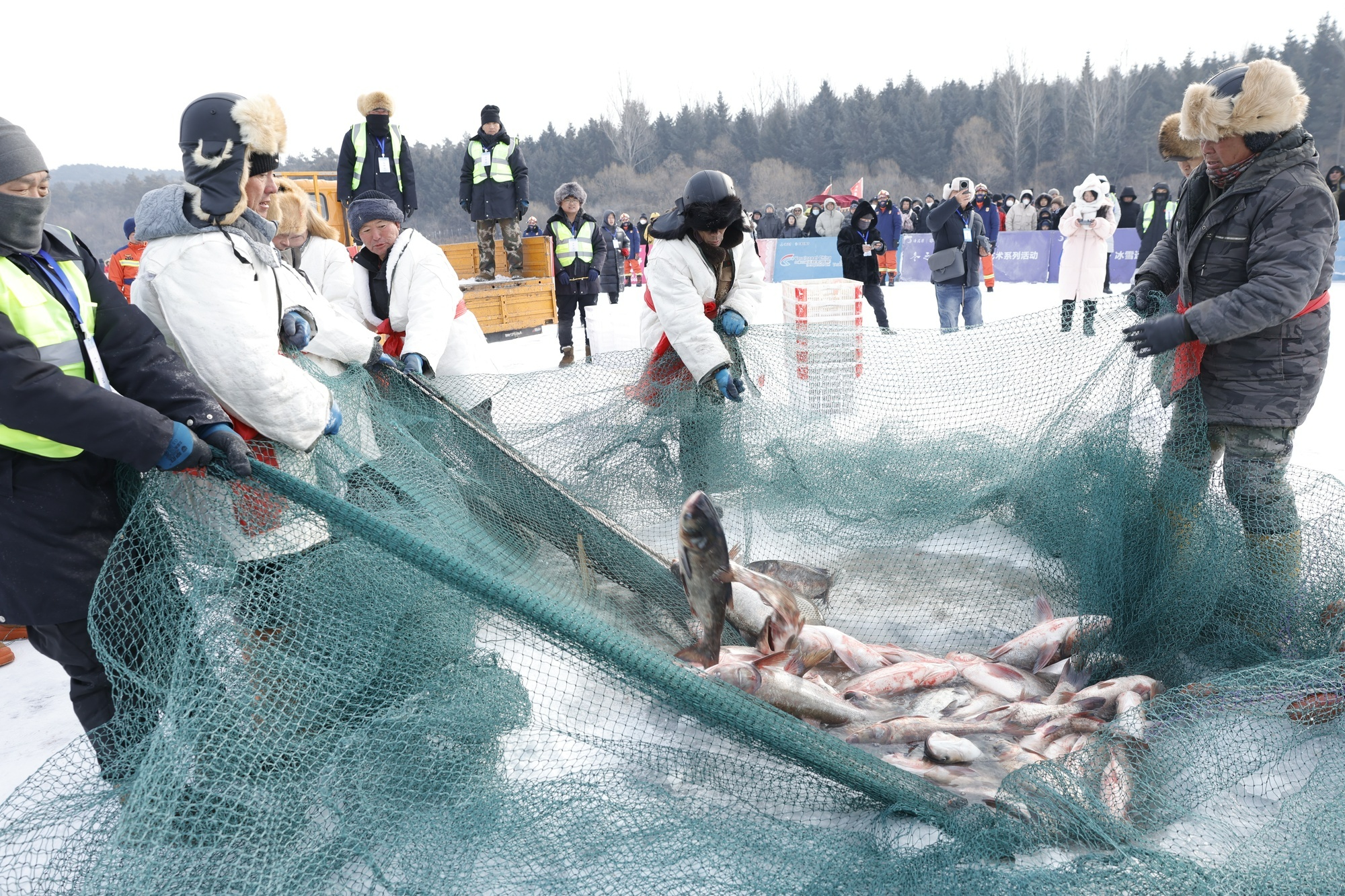 伴隨著“魚把頭”一聲令下,數(shù)萬條活魚躍出水面,“冰湖騰魚”的盛景瞬間點(diǎn)燃寒冬。