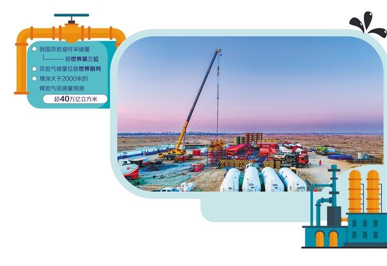 資源稟賦支撐戰(zhàn)略選擇。數(shù)據(jù)顯示,全球頁(yè)巖油儲(chǔ)量在11萬(wàn)億噸至13萬(wàn)億噸之間,頁(yè)巖氣資源量約為456萬(wàn)億立方米,是當(dāng)前世界常規(guī)天然氣探明總儲(chǔ)量的2倍以上。我國(guó)頁(yè)巖油可采儲(chǔ)量居世界第三位,頁(yè)巖氣儲(chǔ)量位居世界前列,埋深大于2000米的煤巖氣資源量預(yù)測(cè)超40萬(wàn)億立方米。
