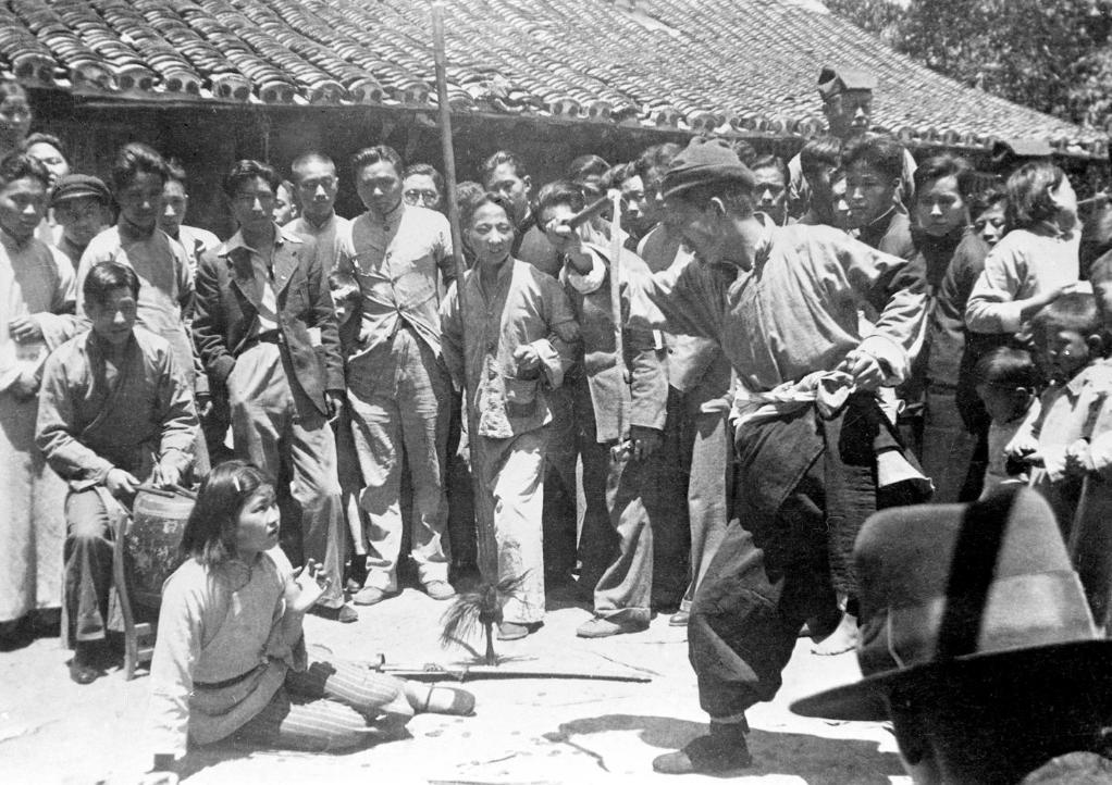 在國(guó)民黨統(tǒng)治區(qū),進(jìn)步的文藝團(tuán)體到農(nóng)村演出抗戰(zhàn)話劇《放下你的鞭子》。該劇是“國(guó)防戲劇”代表作。(新華社發(fā))