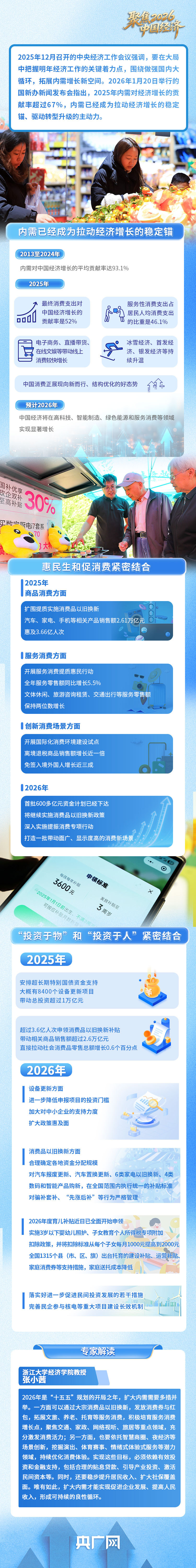 國新辦最新發(fā)布的數(shù)據(jù)顯示,2025年,內(nèi)需對經(jīng)濟增長的貢獻率超過67%,其中消費貢獻率達到52%。新需求引領新供給,新供給創(chuàng)造新需求,已經(jīng)形成了良性互動。同時,國內(nèi)供強需弱的矛盾比較突出,中國經(jīng)濟如何向“內(nèi)”求變?2026年擴大內(nèi)需工作應從哪些方面著手,最終惠及民生?央廣網(wǎng)邀請相關專家進行解讀。