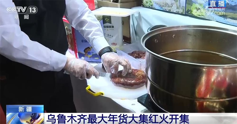 既然是新疆的年貨大集,自然少不了當(dāng)?shù)氐奶厣a(chǎn)品。大家看這一排展示的都是新疆各族百姓春節(jié)前最愛采購的年貨,這是熏馬肉,當(dāng)?shù)匾步凶黢R腸子,熱騰騰的馬肉煮好后是新疆春節(jié)餐桌上妥妥的“硬菜”;此外,還有各類奶制品和其他牛羊肉制品。這兩天采訪中記者了解到,很多在新疆工作的外地朋友都會在春節(jié)返鄉(xiāng)前選購一些新疆特色年貨帶回老家。怎么樣?這樣的回家禮物是不是很特別?