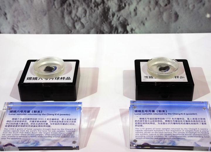 2025年11月5日在第八屆進(jìn)博會(huì)國(guó)家展中國(guó)館拍攝的“嫦娥五號(hào)”月壤和“嫦娥六號(hào)”月壤。