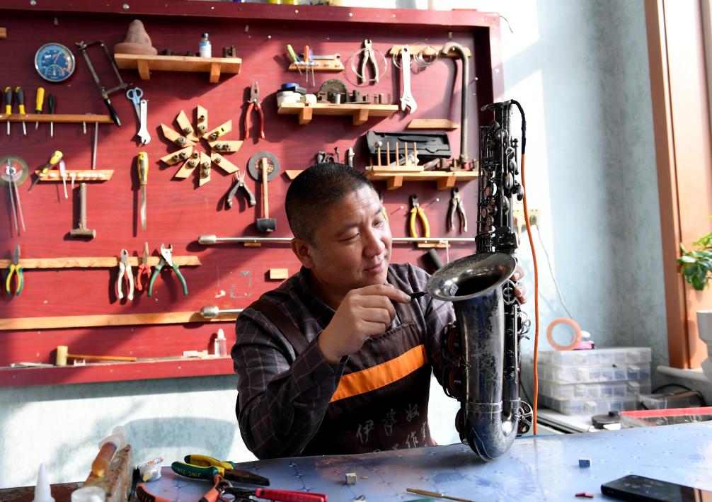 周衛(wèi)倉在工作室內(nèi)維修薩克斯。新華社發(fā)(蘇小立 攝)