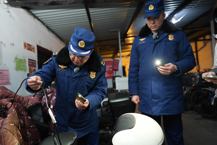 2月3日,消防站副站長(zhǎng)王會(huì)軍(左)和消防員賈超(右)在雙榆樹南里小區(qū)的電動(dòng)車停車棚檢查充電安全。新華每日電訊記者謝晗 攝