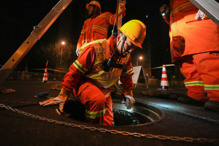 白天人多車密,深夜才是管網(wǎng)維護(hù)的“主戰(zhàn)場(chǎng)”。下井前,班組在井口拉好警示帶,擺好反光錐。井蓋掀開(kāi),熱氣與冷空氣凝成薄霧。按照安全作業(yè)的鐵律——“先通風(fēng)、再檢測(cè)、后作業(yè)”,班組先是對(duì)小室進(jìn)行30分鐘通風(fēng)置換,隨后將檢測(cè)儀探入井下:“氧氣含量20.9%,一氧化碳、硫化氫和易燃易爆氣體含量均為零——合格!”