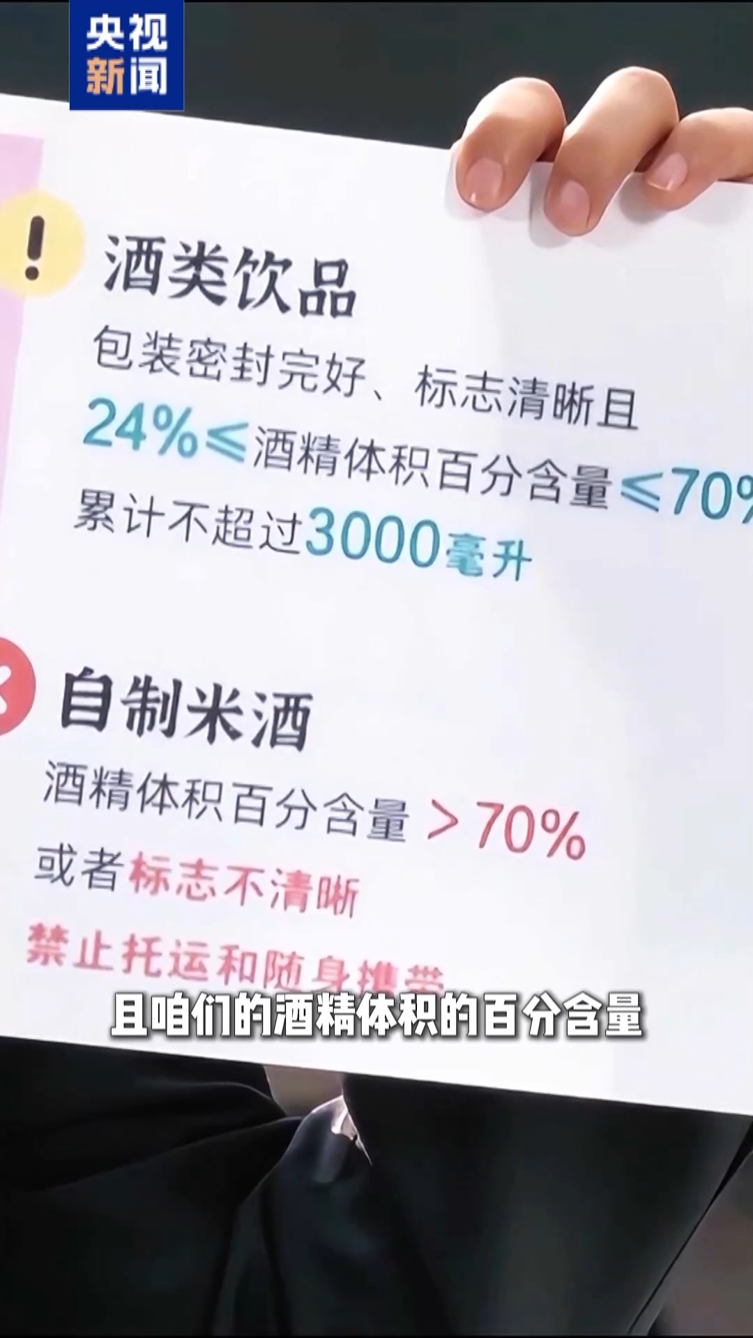 國(guó)鐵沈陽(yáng)局長(zhǎng)春客運(yùn)段列車長(zhǎng) 劉影:酒能帶,但是有幾個(gè)前提,首先包裝要完好,而且標(biāo)志清晰,酒精體積的百分含量在24%和70%之間,總攜帶量不要超過(guò)3000毫升。