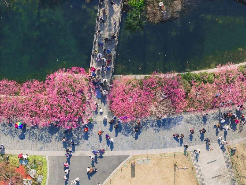 與常州遙相呼應,江城武漢的東湖梅園里,三萬余株梅花傲雪凌霜。梅香幽幽、沁人心脾,身著漢服的游客梅下留影,闔家出游的市民漫步賞梅,盡享團圓溫馨時光。紅燈籠點綴在紅白梅枝間,歡聲笑語漫過整個園區(qū),將江城的年味渲染得熱氣騰騰。
