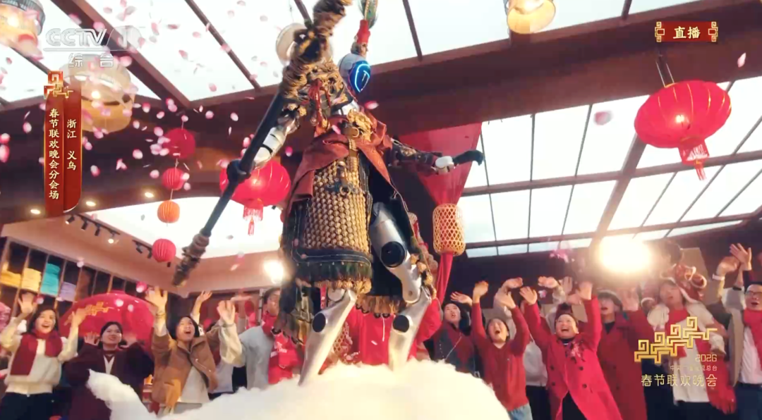 義烏分會場,演員張若昀與披上《黑神話:悟空》戰(zhàn)袍的浙江新特產(chǎn)——宇樹機器人熱情互動。機器人化身“大圣”駕著“筋斗云”從天而降的畫面,引得網(wǎng)友直呼驚艷。