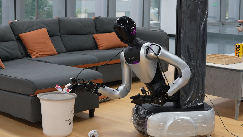 隨著人工智能和具身智能技術的加速演進,更具前瞻性的“AI+服務”探索正在開展。在合肥零次方機器人有限公司,研發(fā)人員在公共衛(wèi)生間復刻場景中,訓練一款輪臂人形機器人完成擦桌子、清潔馬桶、疊衣服、使用吸塵器打掃衛(wèi)生等任務。